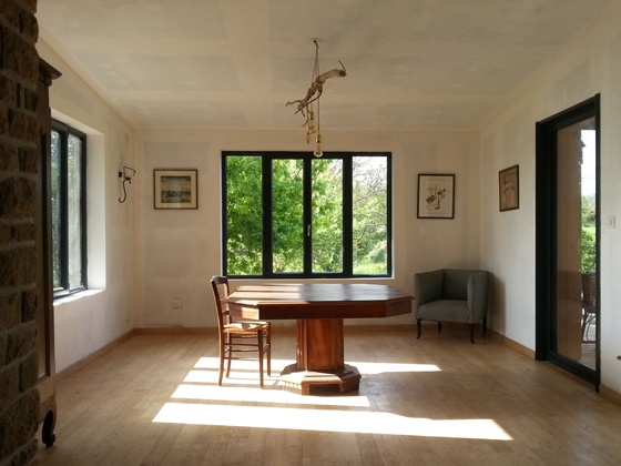 Une entrée séparée et une pièce de vie ont été créées en partie Sud de l’habitation. Baignée de lumière, la nouvelle pièce accède à l’existant par une grande ouverture créée dans le mur en pierre.